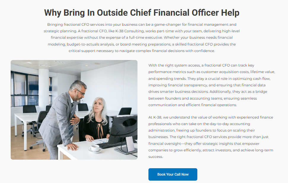 K-38 Consulting, LLC specializes in providing professional fractional CFO services that help businesses improve financial performance and achieve sustainable growth. Their team collaborates closely with clients to understand their unique challenges and develop tailored financial strategies.